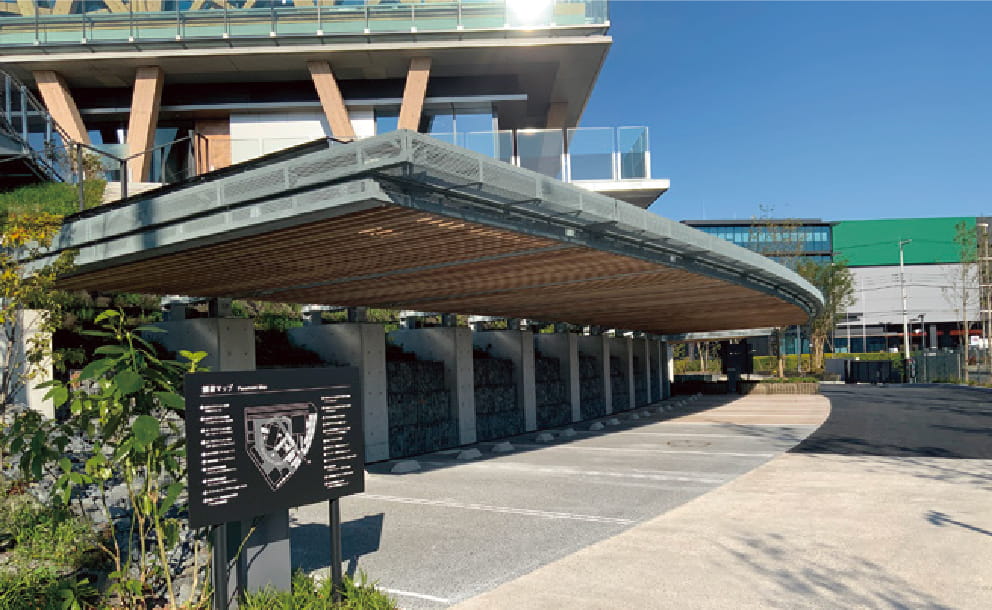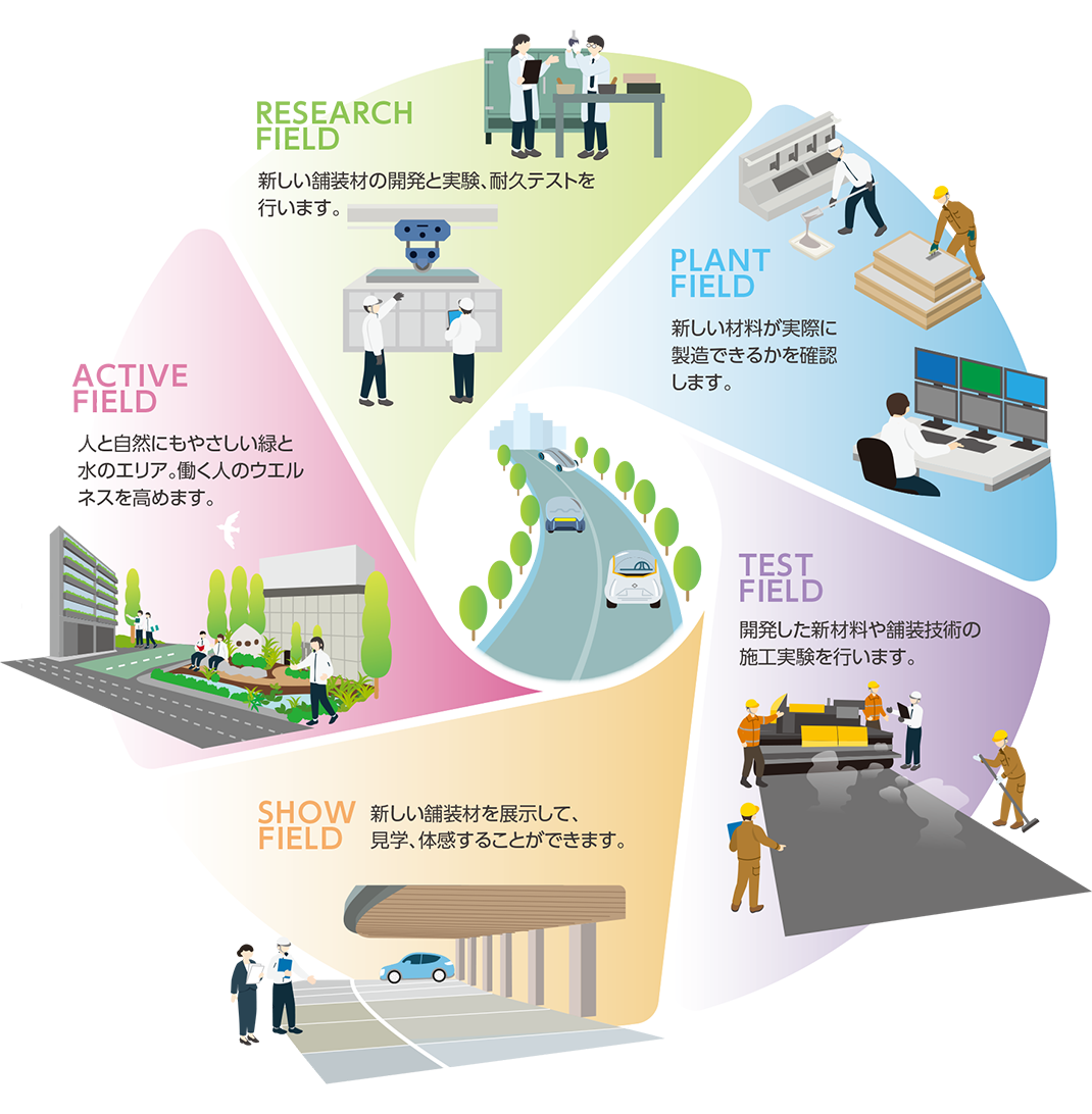 低炭素コンクリート・アスファルト、道路インフラ関連の次世代技術を開発する研究施設です。施設内の5つのフィールドが連携することで、開発から製造、施工、展示まで一体で推進します