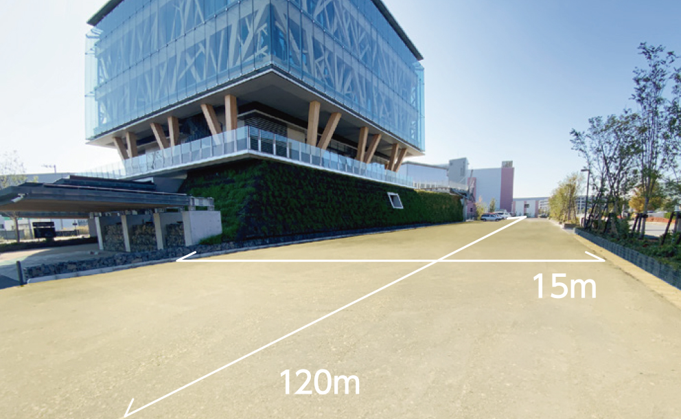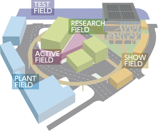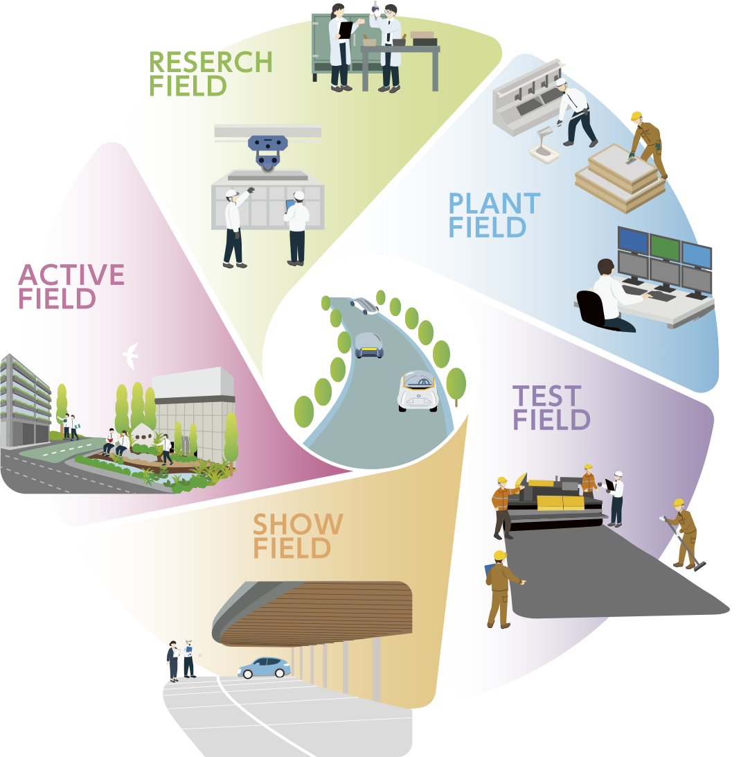 低炭素コンクリート・アスファルト、道路インフラ関連の次世代技術を開発する研究施設です。施設内の5つのフィールドが連携することで、開発から製造、施工、展示まで一体で推進します
