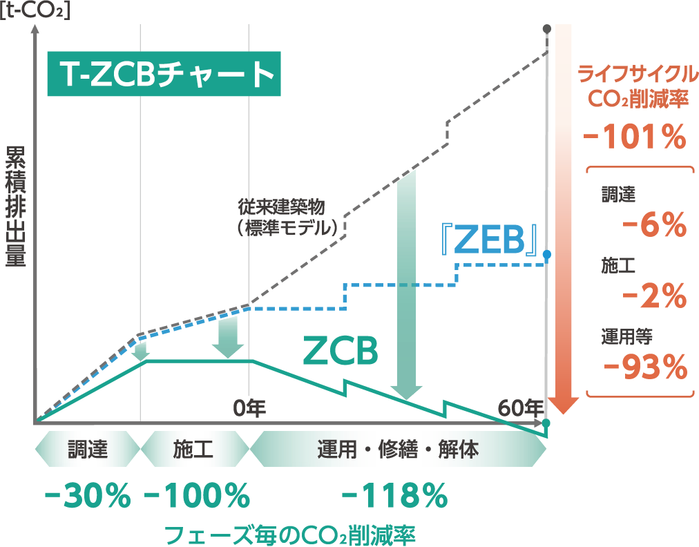 T-ZCB®(ゼロカーボンビル)は、当社が開発した、建物の資材調達から解体までのライフサイクル全体におけるCO₂排出量や、CO₂削減技術の効果を可視化するための評価指標です。